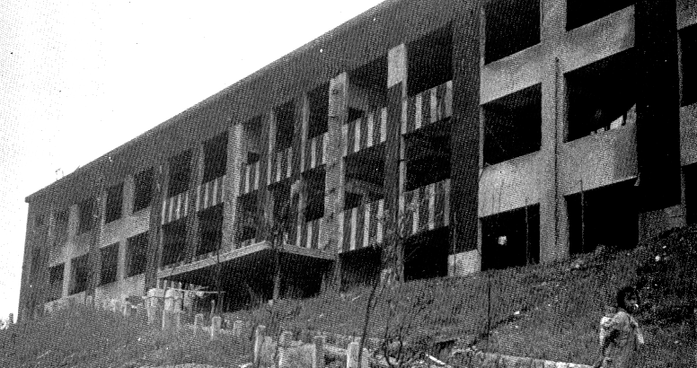 ●浦上川沿いに南の方に歩き、梁川橋のたもとにある梁川公園までくると、公園の背後の丘の上に淵中学校が見えて来ます。1992年に建てられた校舎です。旧校舎は1940年に建てられ鉄筋コンクリート3階建ての本館、L字型の木造2階建ての校舎、中庭には鉄筋木造の体育館と木造平屋の建物がありました。1945年5月には教員も生徒(国民学校高等科1、2年生、今の中学1、2年生に当たる)も軍需工場へ動員されており、学校教育は完全に停止していました。 被爆当日、校内には三菱電気と三菱造船所の工場が移転していて、68人が作業をしていました。そのうち教職員が2人と工員15人が焼死しました。動員先や家庭での職員、生徒の死亡者は138人でした。そして原爆により、本館校舎は全焼、体育館は骨組みだけになり、他の木造校舎と平屋の建物も全焼、崩壊しました。1946年3月の卒業式は、窓もなく焼けただれた校舎の中で行われました。翌年の4月、新学制により淵国民学校は長崎市立淵中学校と改称されました。 |