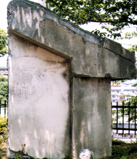 ●正門のすぐ右脇には、1984年の建て替えの際に保存された旧体育館の外壁遺構が展示されています。原爆の熱線で一部炭化した木材が見えています。 また、正門から入って右手の「つどいの広場」には、『平和の輝生』と題する卒業生一同からのモニュメントや、1992年の校舎建て替えの際に保存された旧校舎玄関支柱と門扉が展示されています。広場の右手奥にある『職員児童戦災死者之碑』(1946年7月20日建立)の右側には「汽車の警笛茂麦の丘に響くのみ」と刻まれています。 |